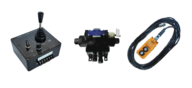 Componentes de control remoto: válvula, botonera de control con cable, palanca de mando (Joystick)